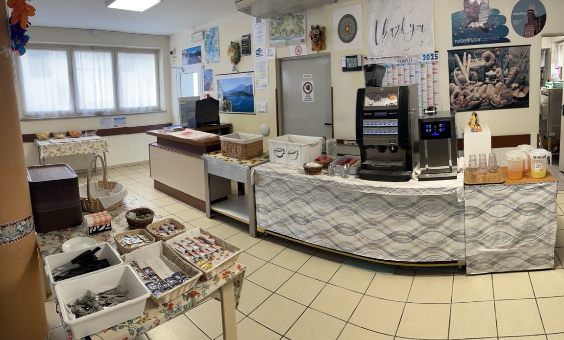 La colazione è servita dalle 7:00 alle 9:00 ed è inclusa nella tariffa del pernottamento. Pane con miele, crema al cacao e nocciola, marmellata e burro (in porzioni singole), formaggio, prosciutto cotto, salame e speck; uovo sodo; frutta; croissant o dolce; succo d'arancia e di ananas; latte freddo; bevanda calda (erogata da apposito distributore: espresso, caffè macchiato, lungo, americano; cappuccino; latte macchiato; cioccolato; caffè d'orzo; tè).